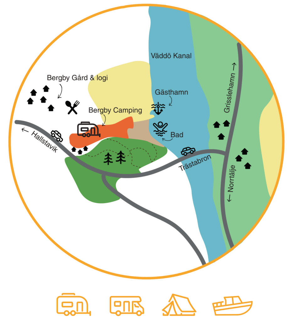 Bergby Camping ligger vid Väddöviken, 4 mil norr om Norrtälje, nära buss som går till Eckerölinjens färja. Vi erbjuder 150 platser för husvagnar, husbilar och tält, samt tre glampingtält och ett vandrarhem med tio mysiga rum. Campingen har en gästhamn för båtar och en fin sandstrand för avkoppling. Grannen Bergby Gård erbjuder restaurang och fler upplevelser.